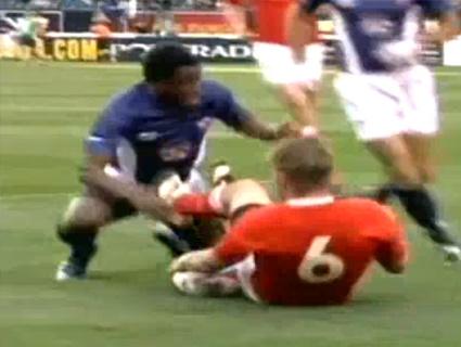 Sauver un essai c’est comme en marquer un, tant au niveau du tableau d’affichage que de l’adrénaline. Le célèbre ailier de Biarritz Olympique nous gratifie d’un sauvetage incroyable lors de la Coupe du monde de Rugby à 7 l’an dernier. Alors que le porteur du ballon fait la différence et fait preuve d’un certain relâchement au moment de marquer l’essai Takudzwa Ngwenya fait l’étalage de sa pointe de vitesse et de sa malice pour taper le bras de son adversaire qui relâche inexorablement le ballon par terre… 5 points (voire 7) dans la musette !